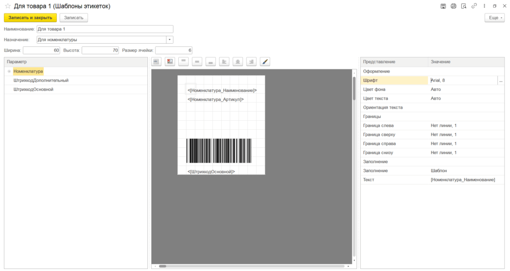 После этого можно добавить нужные параметры и отредактировать текст. Сохраняем шаблон, который затем будет доступен для выбора при маркировке.